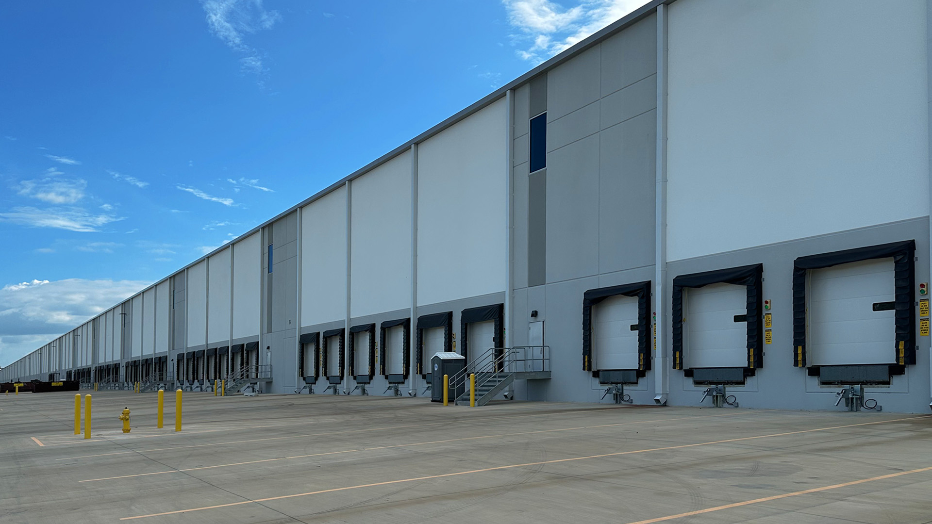 The distribution center is equipped with 151 dock doors and five drive-in dock doors, supported by 26 miles of interior conveyors. Structurally, it incorporates 4,500 tons of joist and deck and 3,666 tons of structural steel, including mezzanines. The building’s infrastructure is equally robust, with more than 95 miles of wire feeder pulls and over 20 miles of under-slab conduit and mechanical piping. On the ground level, the 45-acre slab on grade required more than 43,209 cubic yards of concrete, while site paving exceeded 506,000 cubic yards.