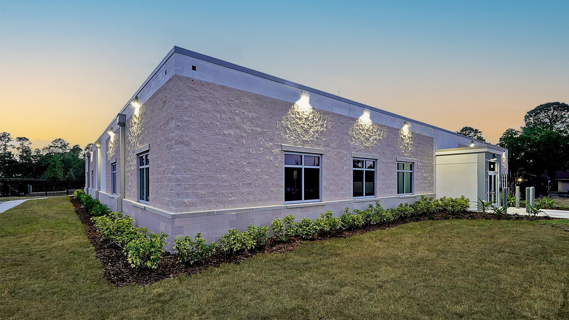 POH+W Architects designed this 12,500 SF single-story Base Building and Tenant Fit-Out for the General Services Administration to house an FBI field office in Daytona Beach, Florida. The design was based on the FBI Program Requirements for a new Resident Agency Office and focused on maximizing space efficiency for both FBI employees and contractors within a compact floor plate. The steel-framed structure features an integrally colored smooth and split-face concrete block exterior, an energy-efficient certified Florida wind zone glazing system, and a high-albedo TPO roof. The building also includes a front weather-controlled entry vestibule. Interior finishes consist of tiled core restrooms with solid surface vanities, LED lighting fixtures, and high CAC ceiling suspension systems.