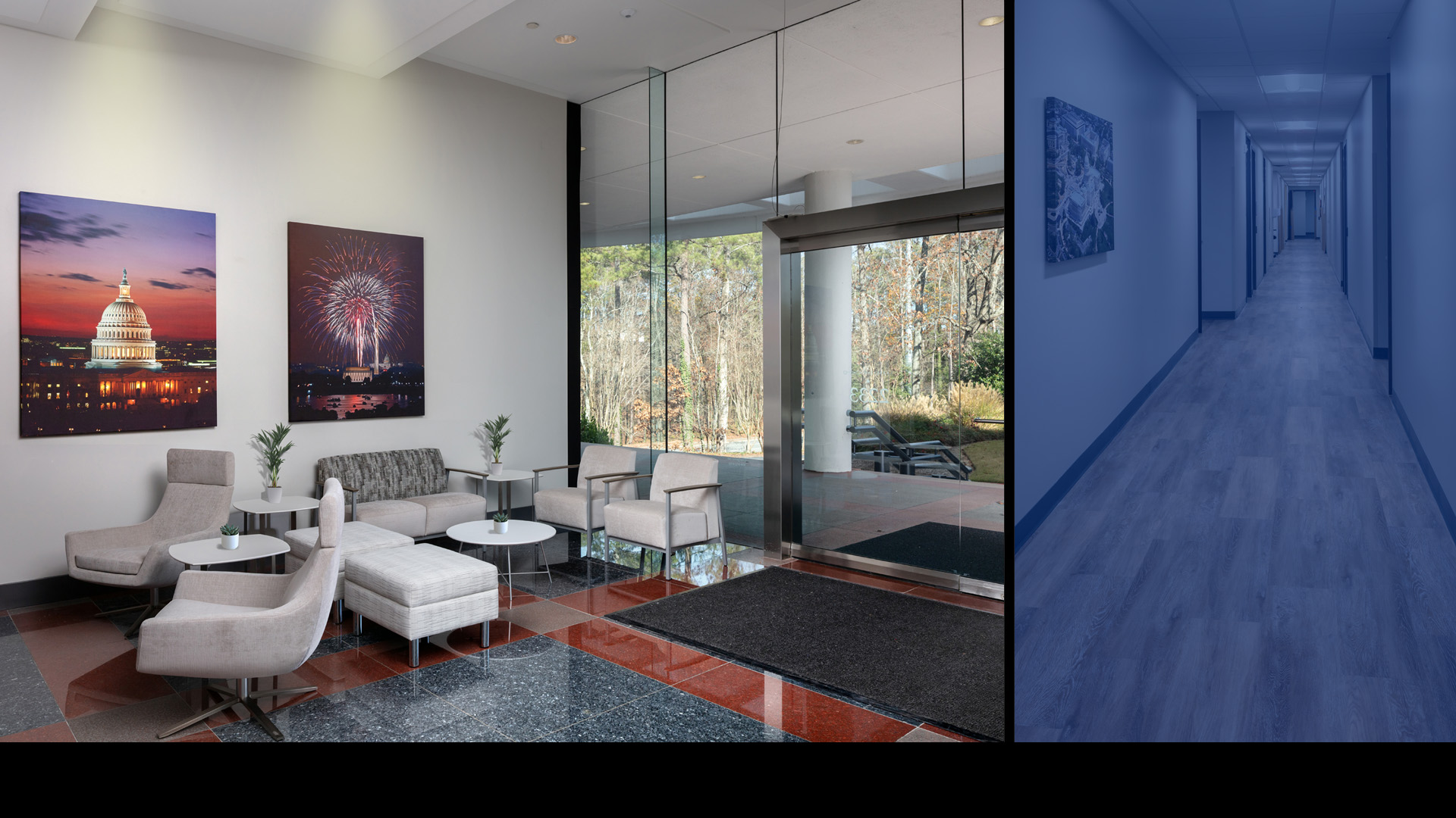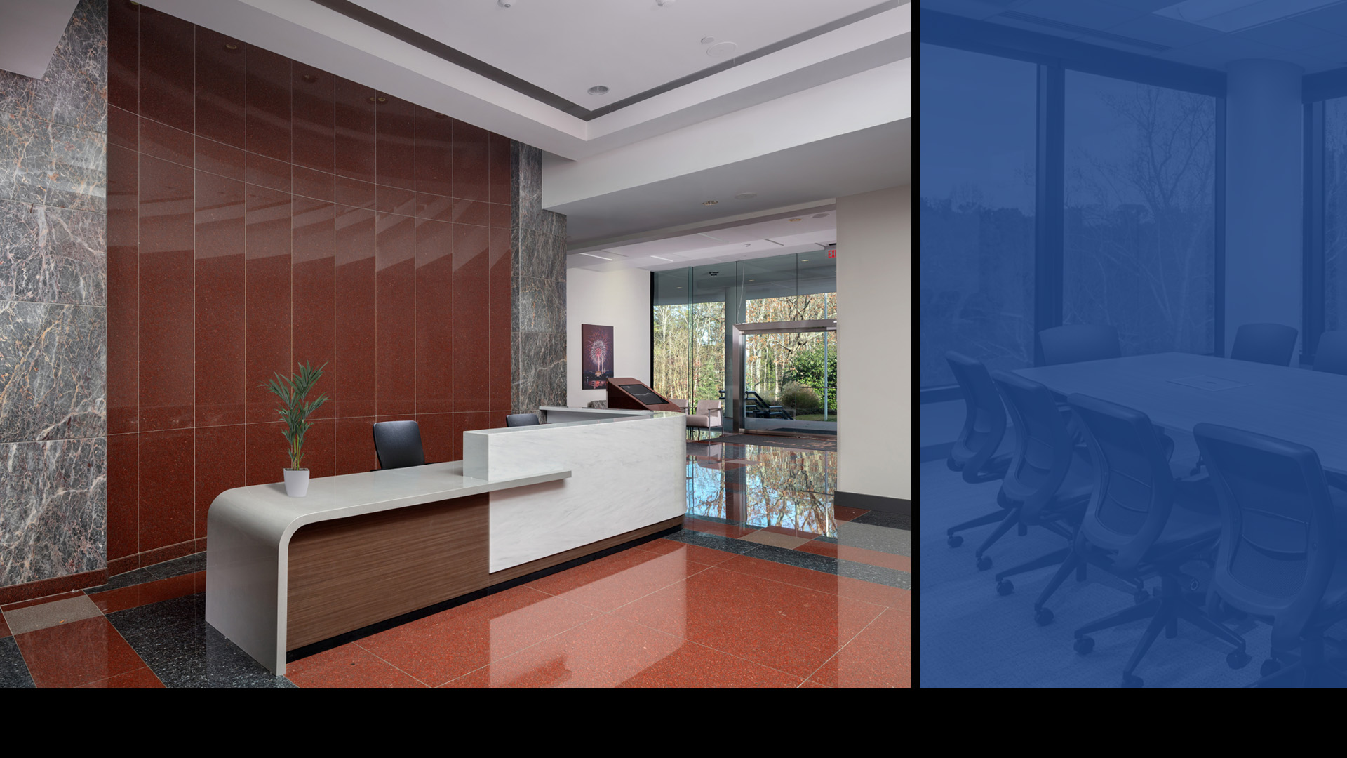 Acoustics were a key design focus, with sound transmission between spaces minimized through thoughtful wall and ceiling detailing and the use of acoustical products. The scope also included a light exterior update, giving the building a more modern office appearance.