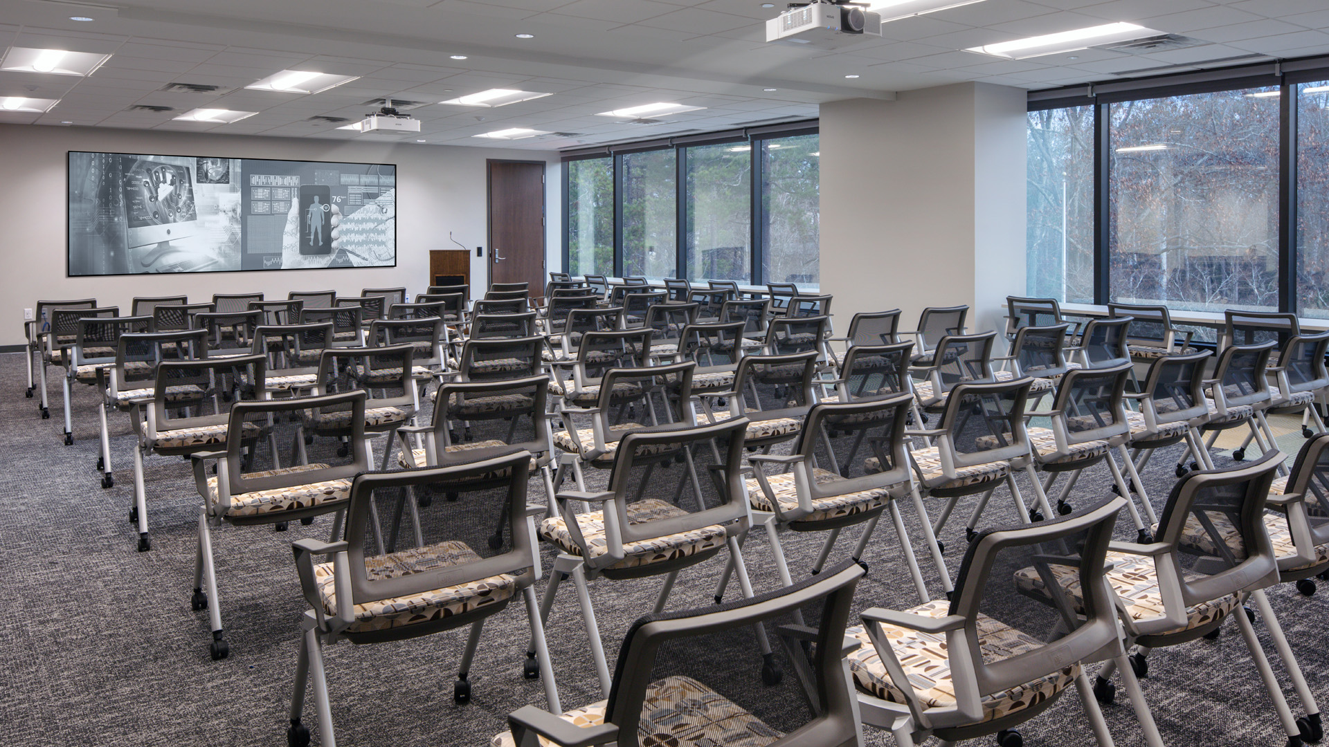 Staff amenities include a fitness center, mothers’ rooms, and meditation rooms. A large town hall space with a movable room divider offers flexibility for larger gatherings. New ADA-compliant restrooms were added on each floor. To ensure uninterrupted service, the project incorporated a data center and an emergency generator.