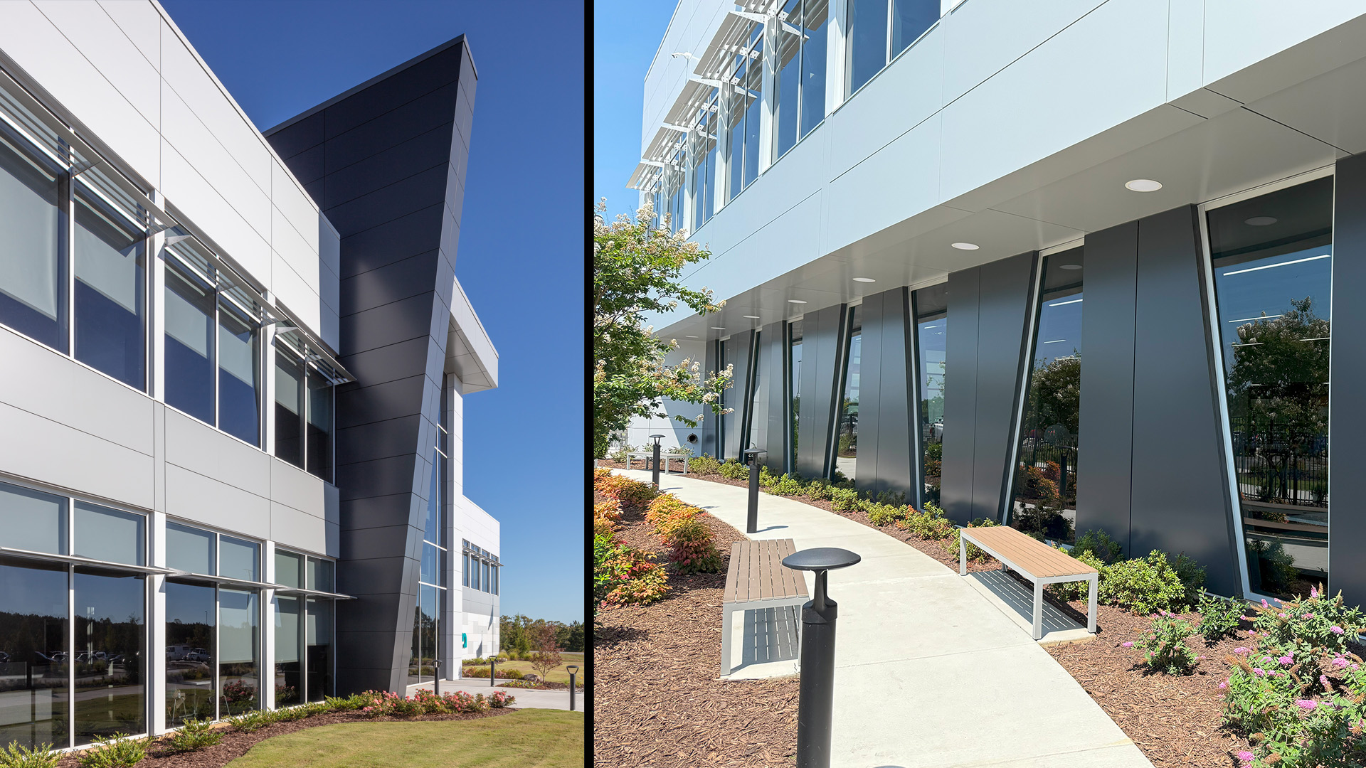 The management office is clad in modern metal panels. The interior is configured in an open work environment to foster employee collaboration and communication. A modern café is a feature, offering a relaxed and casual space for employees to connect and collaborate. The café is designed with a covered outdoor patio with comfortable seating and lush greenery. A flexible training room prioritizes continuous learning and development. The space was designed with movable furniture, advanced technology, and versatile layouts to accommodate different training needs.