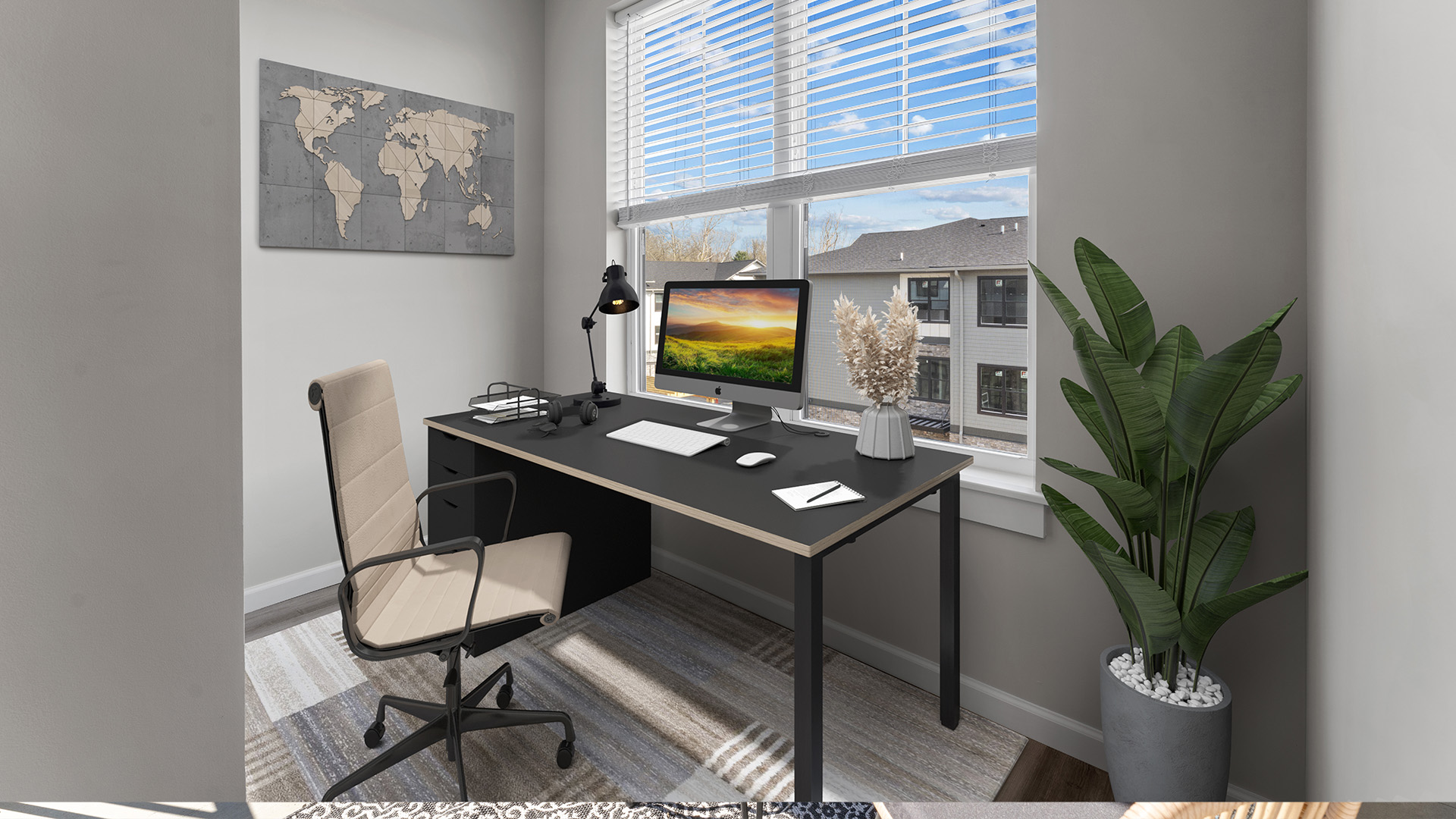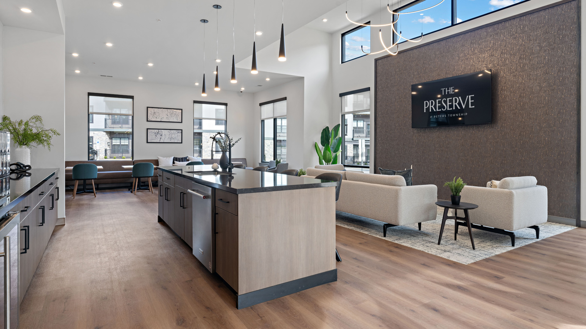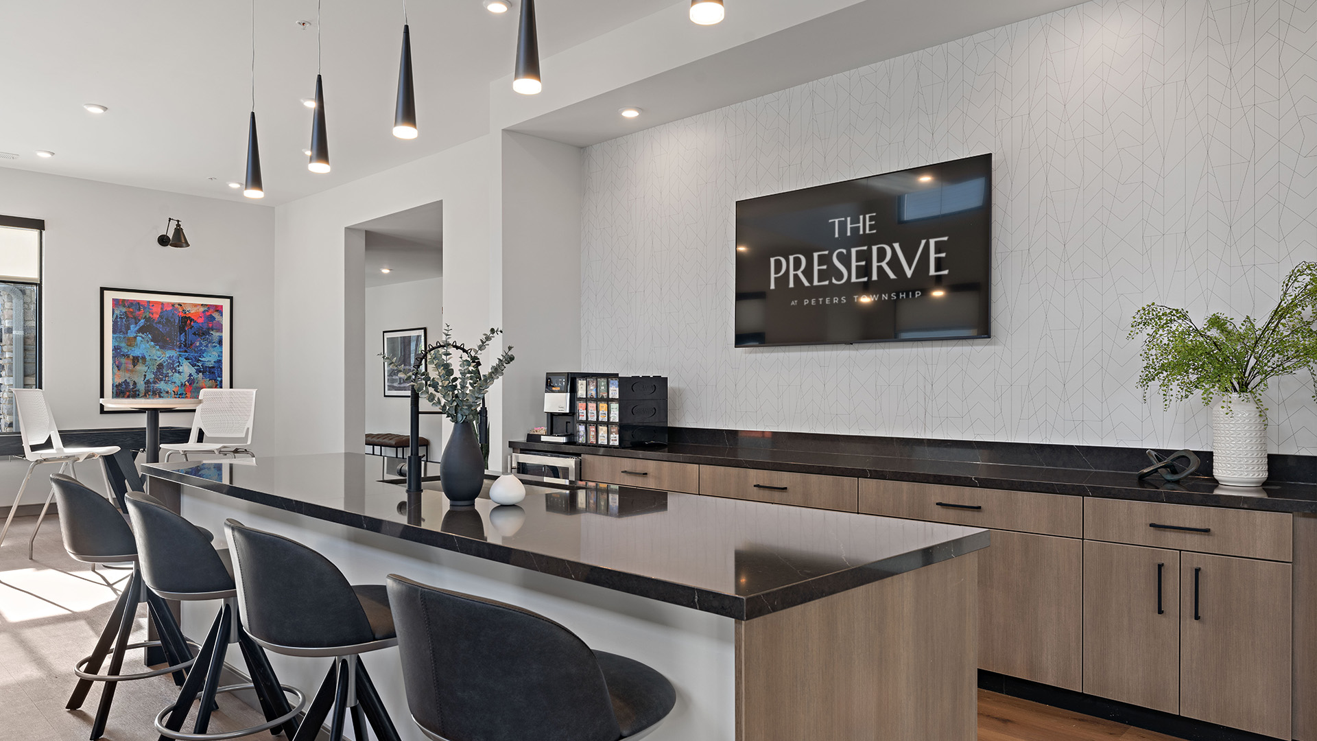 This property has a fully furnished model unit selected by POH+W Interior Design Studio. The interiors team worked with a local furniture dealer during the procurement and installation process. The unit shows intent for space planning ideas to interested guests touring the Preserve at Peters Township.